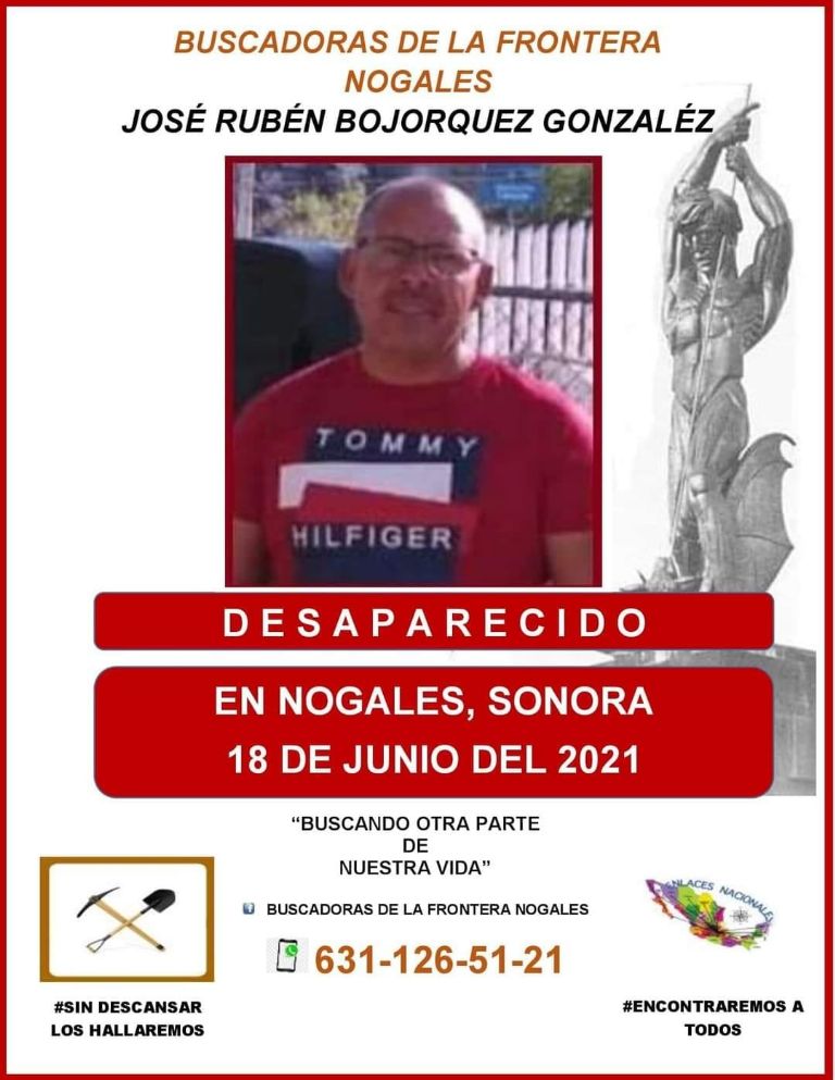 Nogales, Sonora.- La noche del pasado viernes, el colectivo Buscadoras de la Frontera Nogales informó sobre la desaparición del señor José Rubén Bojórquez González, residente de Nogales, de quien nada se sabe desde hace varios días.