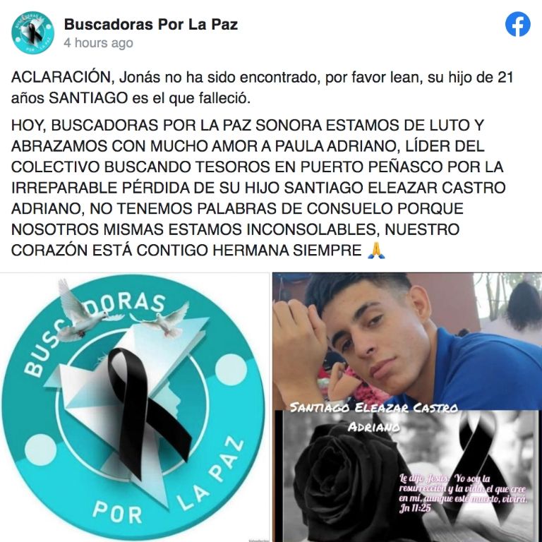Buscadoras por la Paz Sonora estamos de luto y abrazamos con mucho amor a Paula Adriano, líder del colectivo Buscando Tesoros en Puerto Peñasco por la irreparable pérdida de su hijo", escribieron las buscadoras.