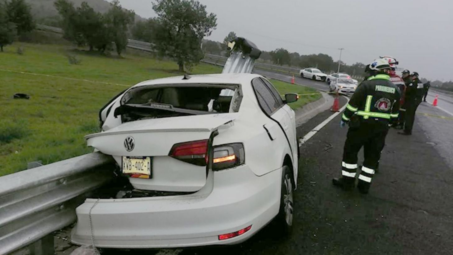 Tlaxcala.- Un accidente fatal cobró la vida de un médico que circulaba a bordo de su vehículo tipo Jetta. El choque provocó que su cuerpo se partiera en dos y una de las mitades saliera eyectada del automóvil.