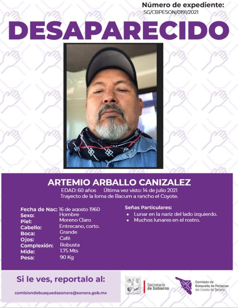 Bácum, Sonora.- La Comisión de Búsqueda de Personas del Estado de Sonora y diversos colectivos piden ayuda para localizar al señor Artemio Arballo Canizalez, quien desapareció hace varias horas al sur de entidad.