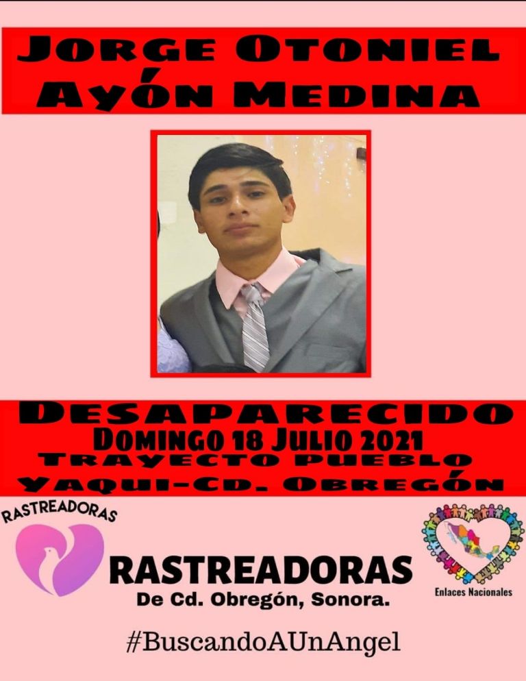 Así lo informó el colectivo Rastreadoras de Ciudad Obregón, quien compartió en Facebook la ficha de búsqueda de Jorge Otoniel y reveló que la última vez que su familia supo algo de él fue el domingo 18 de julio de 2021.