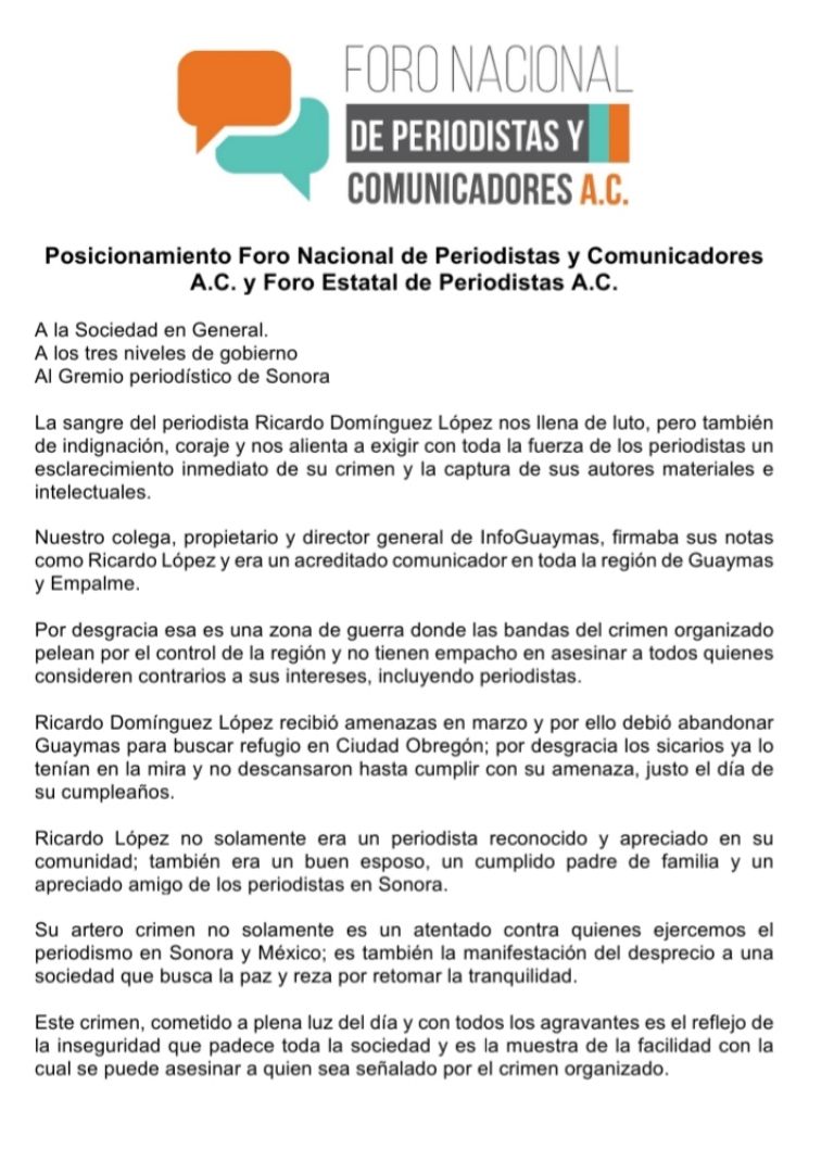 La sangre del periodista Ricardo Domínguez López nos llena de luto, pero también de indignación, coraje y nos alienta a exigir con toda la fuerza de los periodistas un esclarecimiento inmediato de su crimen y la captura de sus autores materiales e intelectuales", se lee.