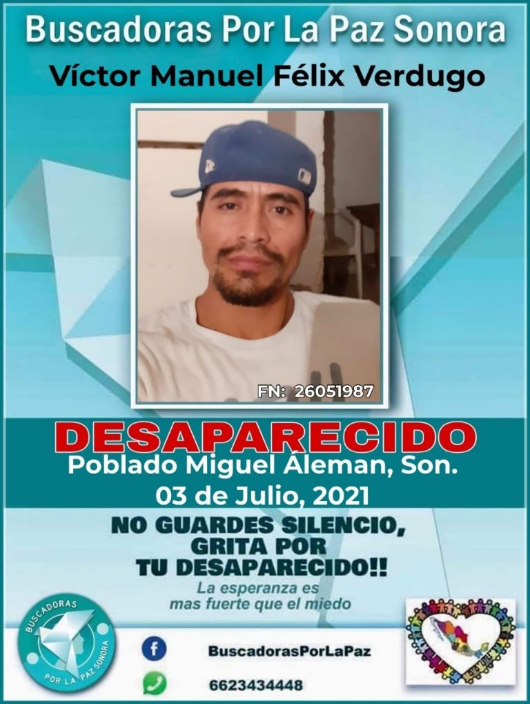 Caborca, Sonora.- El colectivo Buscadoras por la Paz informó sobre la desaparición de Víctor Manuel Félix Verdugo, quien se encuentra desaparecido desde hace poco menos de un mes en la comunidad de Miguel Alemán, municipio de Hermosillo.