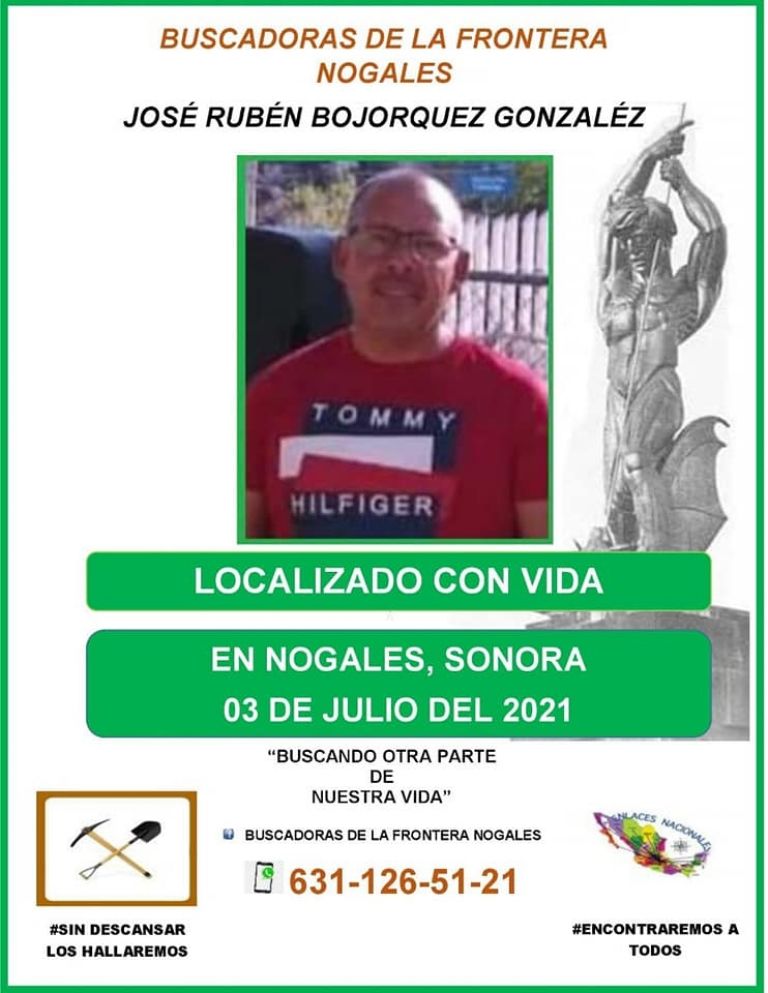 Nogales, Sonora.- La tarde de este sábado 3 de julio, el colectivo Buscadoras de la Frontera Nogales informó que el señor José Rubén Bojórquez González, fue localizado con vida tras reportarse su desaparición en la ciudad de Nogales.