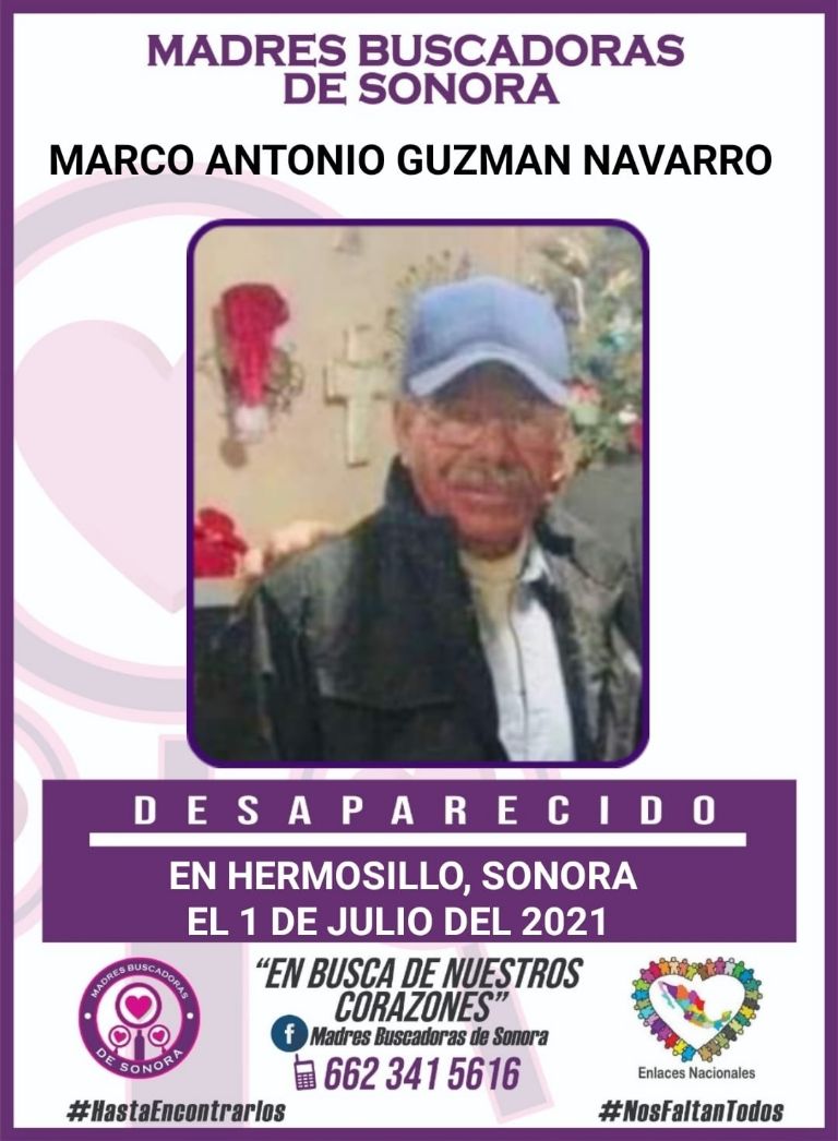 Hermosillo, Sonora.- La tarde de este lunes 5 de julio, el colectivo Madres Buscadoras de Sonora reportó la lamentable desaparición del señor Marco Antonio Guzmán Navarro, de quien no se sabe nada desde hace varios días en Hermosillo.
