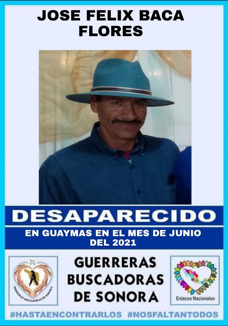 Guaymas, Sonora.- El colectivo Guerreras Buscadoras de Sonora reportó este lunes 6 de julio que el señor José Félix Baca Flores, residente de Guaymas, se encuentra en calidad de desaparecido desde hace varias semanas.
