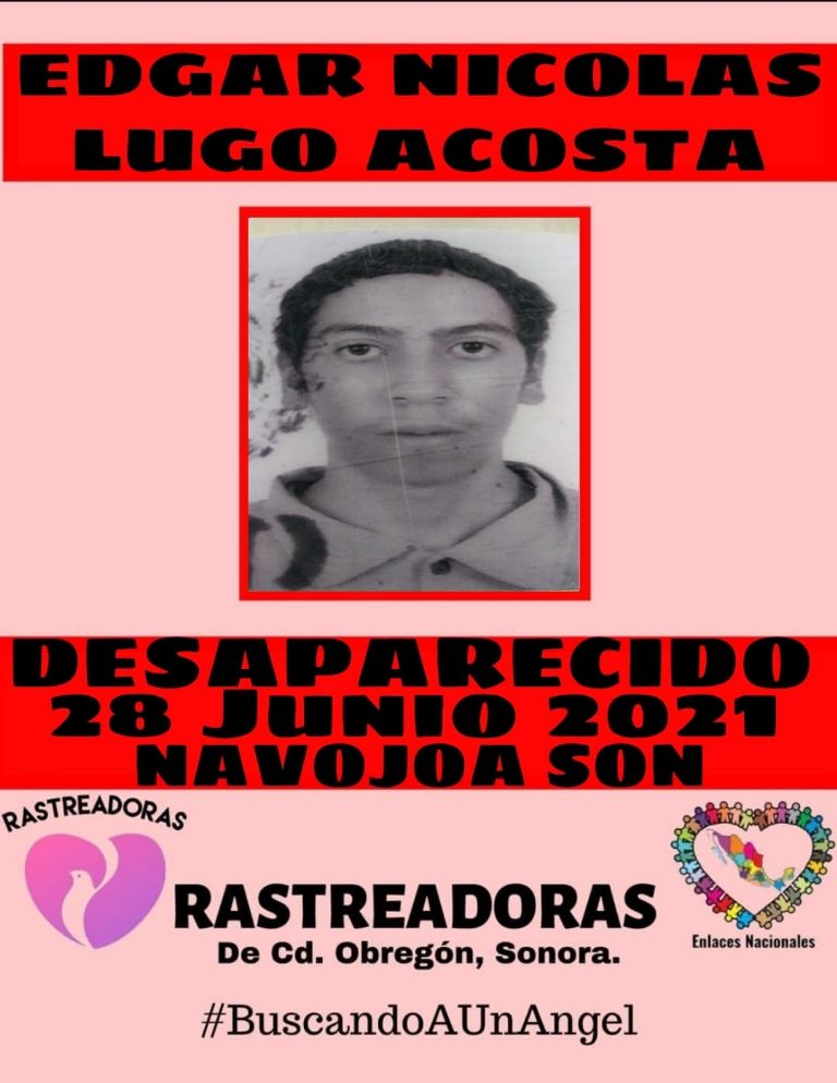 Navojoa, Sonora.- La tarde de este jueves 12 de agosto, el colectivo Rastreadoras de Ciudad Obregón informó sobre la desaparición de Edgar Nicolás Lugo Acosta, de quien nada se sabe desde hace más de un mes en Navojoa, Sonora.
