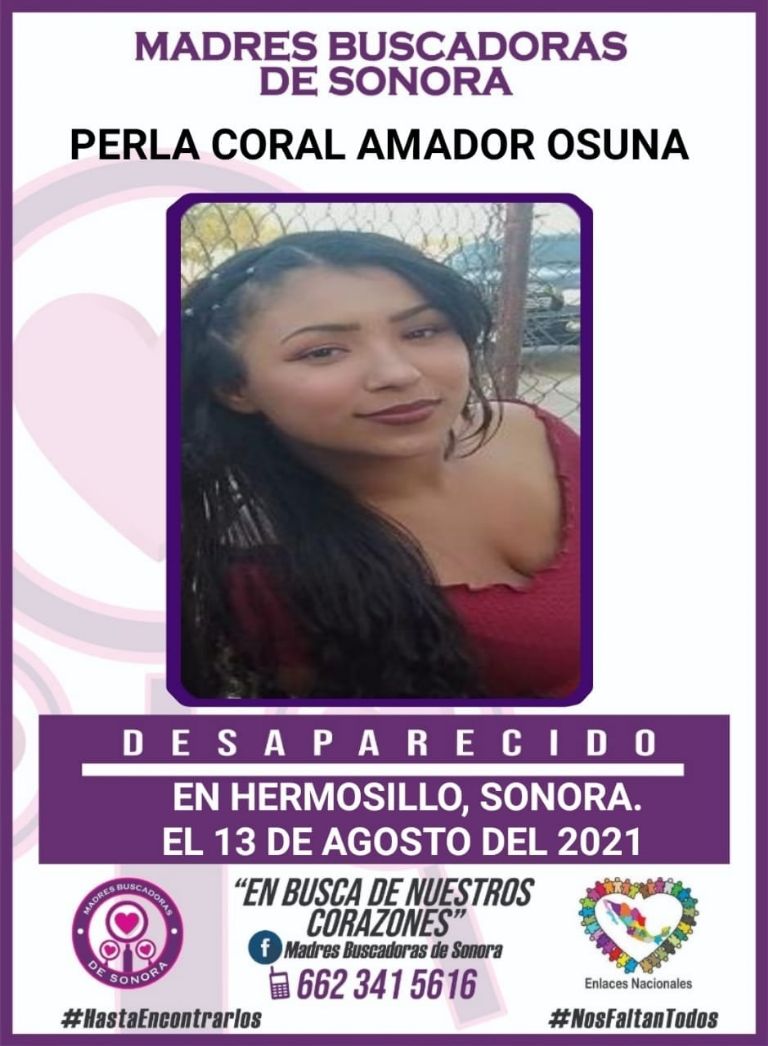 Hermosillo, Sonora.- Amigos y familiares piden la colaboración de la comunidad para encontrar a la joven Perla Coral Amador Osuna, quien se encuentra en calidad de desaparecida junto a su bebé desde hace varios días en Hermosillo, Sonora.