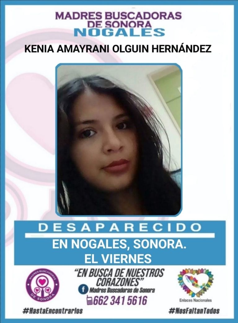 Buscamos a mi sobrina se perdió en Nogales, Sonora, Kenia Amayrani Olguín Hernández desde el viernes en la madrugada se desconoce de su paradero por favor estamos muy desesperados, por favor compartan, Dios los bendiga", se lee.