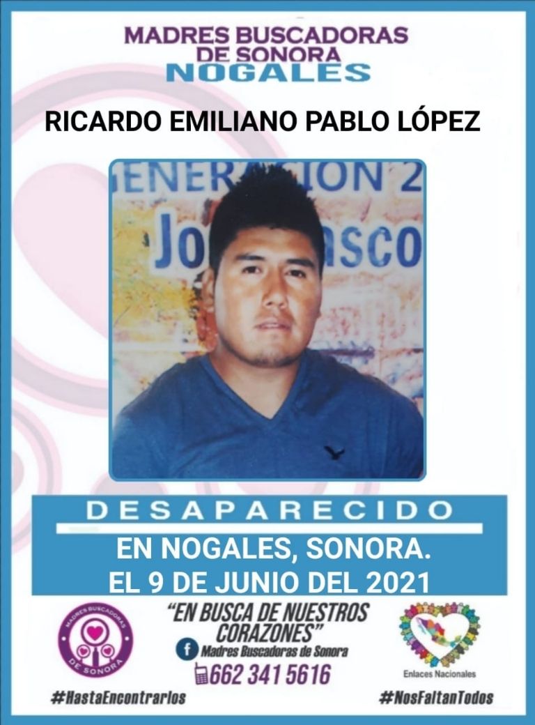 Nogales, Sonora.- Ayer por la noche, el colectivo Madres Buscadoras de Sonora reportó la desafortunada desaparición de Ricardo Emiliano Pablo López, de quien no se sabe nada desde hace casi un mes en la ciudad de Nogales, Sonora.
