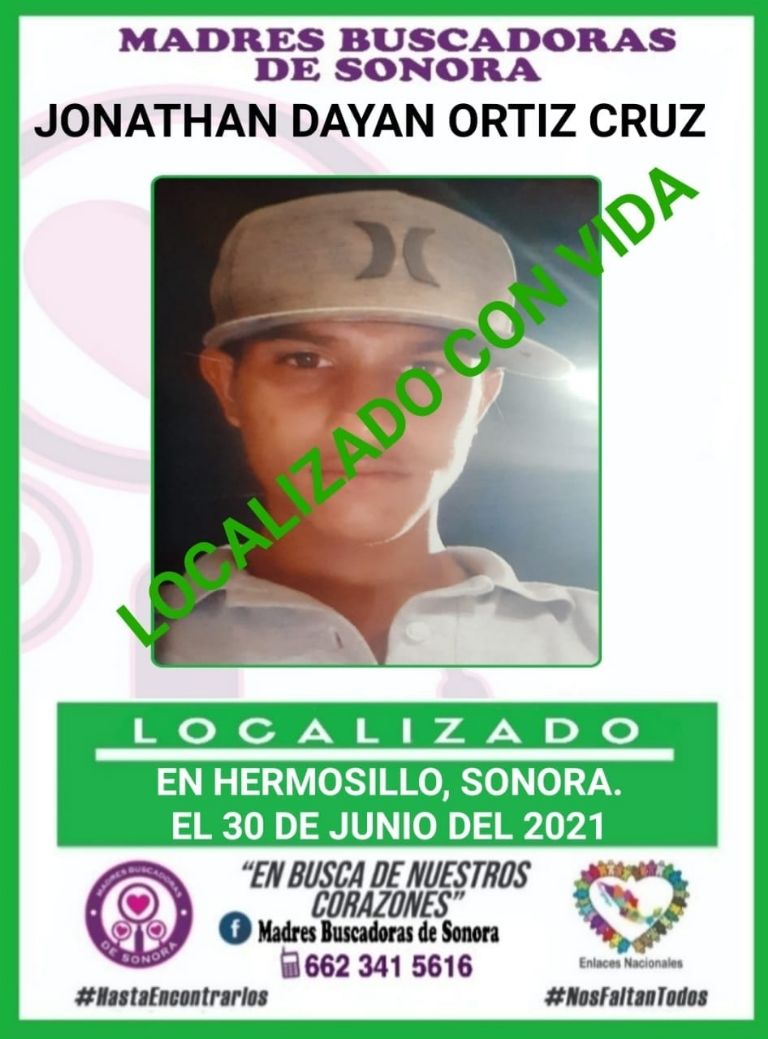 Fue el colectivo Madres Buscadoras de Sonora, quien a través de redes sociales confirmó la buena noticia y reveló que Jonathan Dayán se encuentra bien de salud y de momento ya está de nuevo en casa junto a sus seres queridos.
