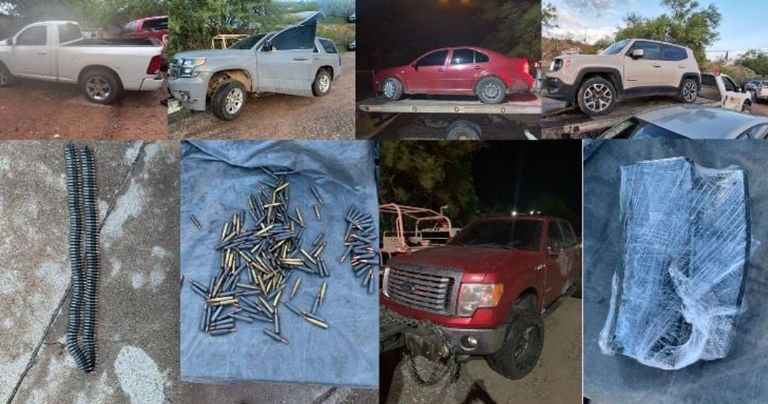 Lo anterior, después de que elementos de la Guardia Nacional localizaron y aseguraron cinco vehículos, un arma de fuego calibre .357 milímetros, dos granadas de fragmentación y un arma de fuego calibre .223 milímetros abastecida con 30 cartuchos útiles en las inmediaciones de la colonia Jardines de la Montaña.