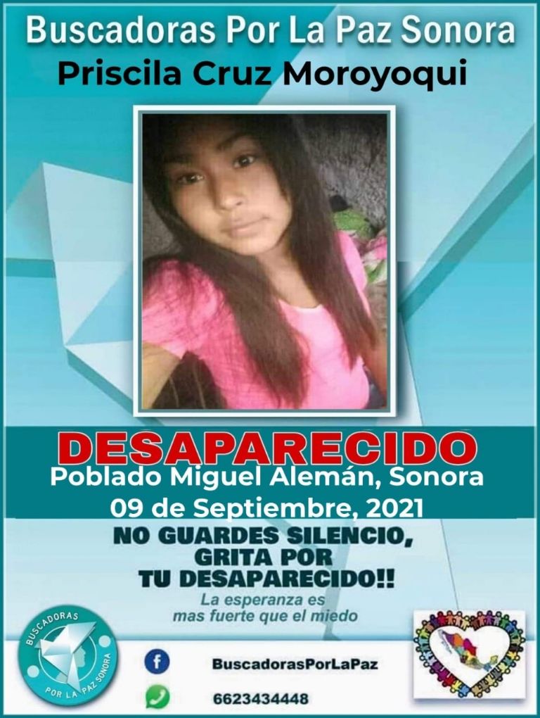 Miguel Alemán, Sonora.- Familiares solicitan la ayuda de la ciudadanía para localizar a Priscila Cruz Moroyoqui, menor de edad que desapareció hace varios días en la comunidad de Miguel Alemán, municipio de Hermosillo.