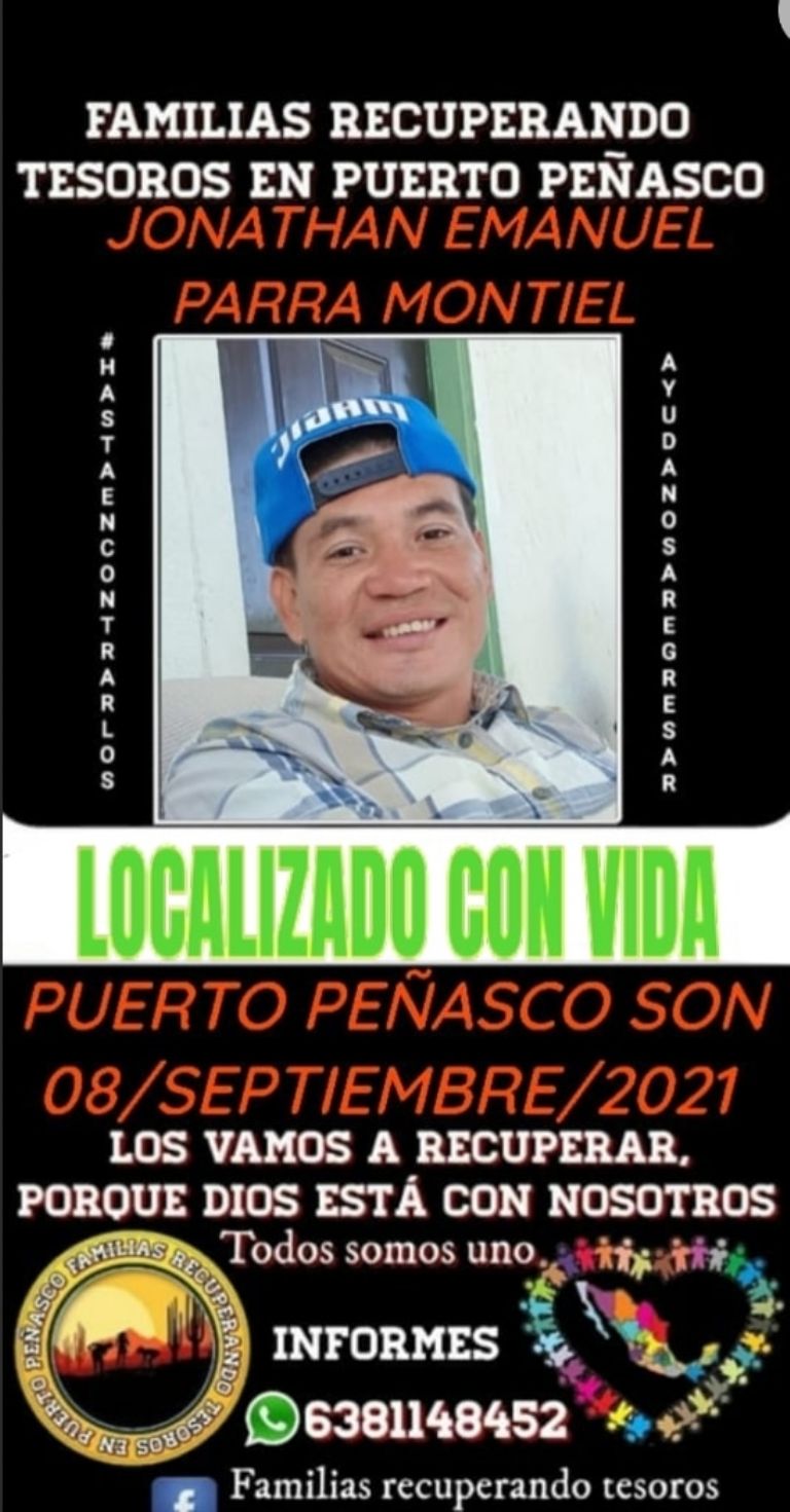 Se trata de Jonathan Emmanuel Parra Montiel, quien fue localizado sano y salvo tras su extravío suscitado el miércoles 8 de agosto del año en curso, así lo confirmó el colectivo Familias Recuperando Tesoros en Puerto Peñasco a través de redes sociales.