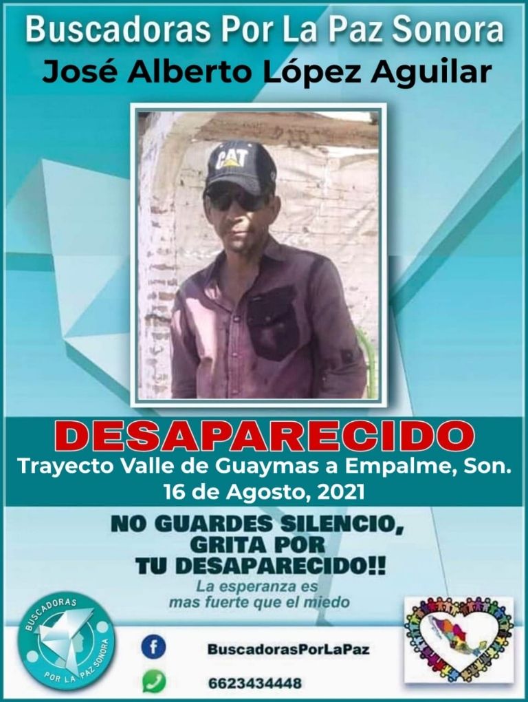 Se trata del señor José Alberto López Aguilar, el cual fue visto por última vez el lunes 16 de agosto de 2021, momento en que se dirigía a su vivienda en la ciudad de Empalme procedente del Valle de Guaymas, sin embargo, nunca llegó.