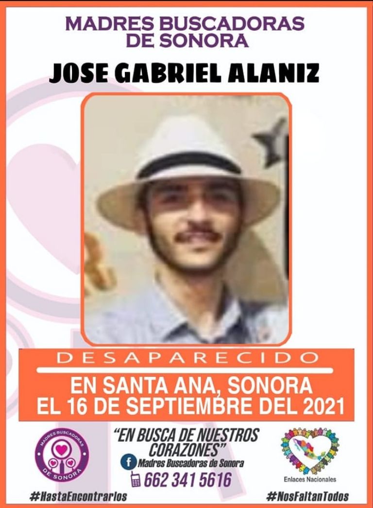 Hermosillo, Sonora.- El colectivo Madres Buscadoras de Sonora solicita la ayuda de la comunidad para localizar al joven José Gabriel Alaniz, quien desapareció hace varios días cuando conducía un vehículo en una carretera de Sonora.
