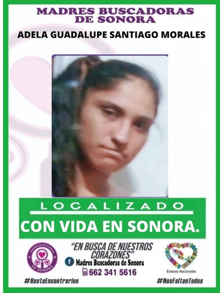 Ciudad Obregón, Sonora.- Luego de casi 3 semanas llenas de angustia e incertidumbre para una familia, este día se informó que Adela Guadalupe Santiago Morales fue localizada con vida en el municipio de Hermosillo tras reportarse su desaparición.