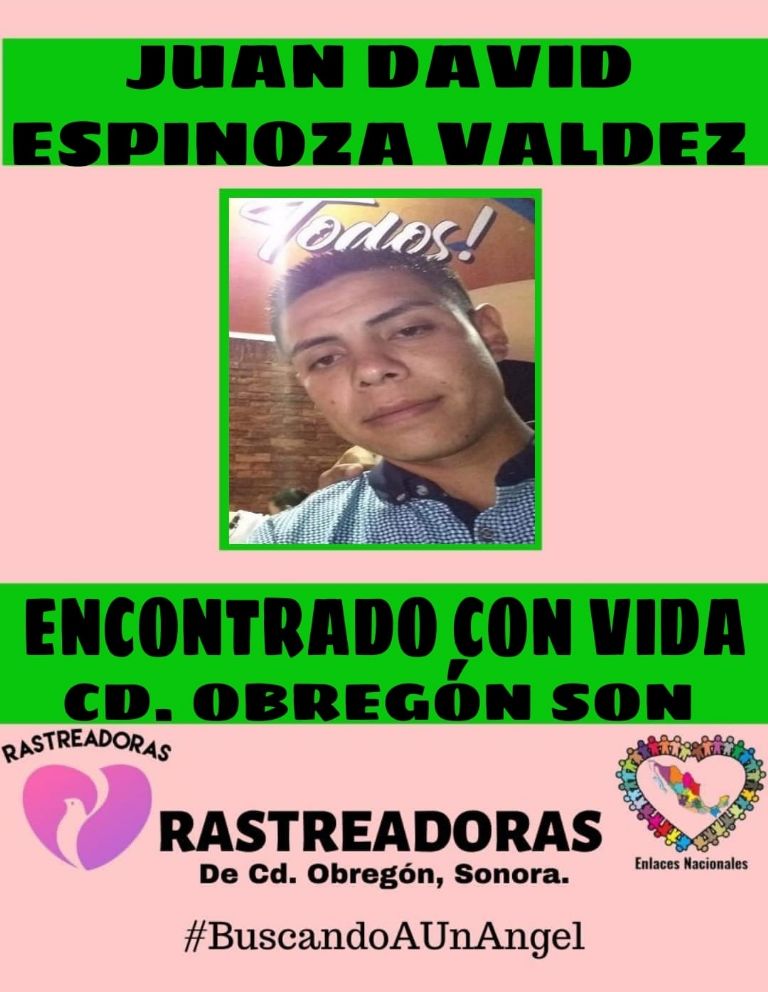 Ciudad Obregón, Sonora.- Luego de casi 2 semanas llenas de angustia e incertidumbre para una familia, se informó que Juan David Espinoza Valdez fue localizado con vida en su natal Ciudad Obregón tras reportarse su desaparición.