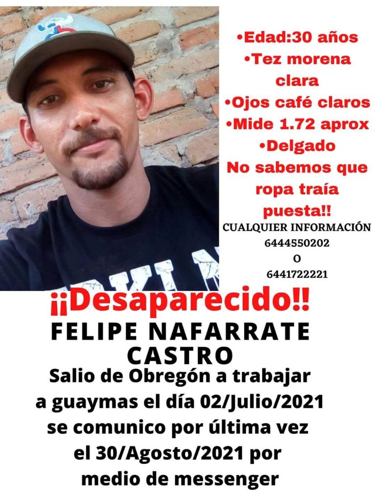 Los familiares de Felipe piden llamar a los números 6444 550202 y 6441 722221 para aportar cualquier información al respecto. Se desconoce si ya se realizó alguna de denuncia de desaparición ante la Fiscalía General de Justicia del Estado de Sonora.