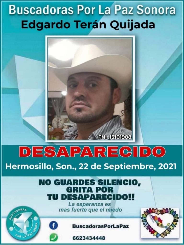 Hermosillo, Sonora.- El colectivo Buscadoras por la Paz solicita la ayuda de la ciudadanía para localizar al señor Edgardo Terán Quijada, el cual se encuentra en calidad de desaparecido desde hace varios días en su natal Hermosillo, Sonora.
