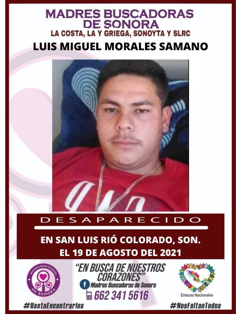 San Luis Río Colorado, Sonora.- Este lunes 27 de septiembre, colectivo Madres Buscadoras de Sonora reportó la depreciación de Luis Miguel Morales Samano, de quien nada se sabe desde el pasado mes de agosto en San Luis Río Colorado, Sonora.