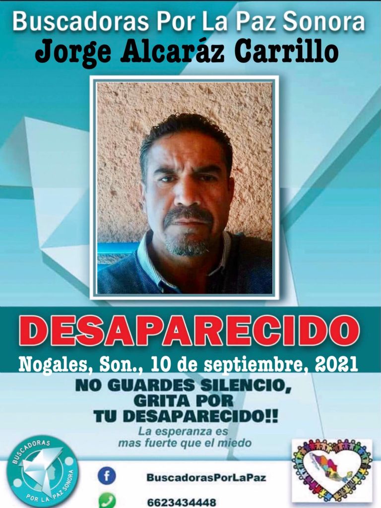 Nogales, Sonora.- El colectivo Buscadoras por la Paz reportó la depreciación del señor Jorge Alcaraz Carrillo, el cual viajó a Nogales, Sonora, pero ya no regresó a su domicilio, hecho que tiene muy angustiados a sus familiares y allegados.