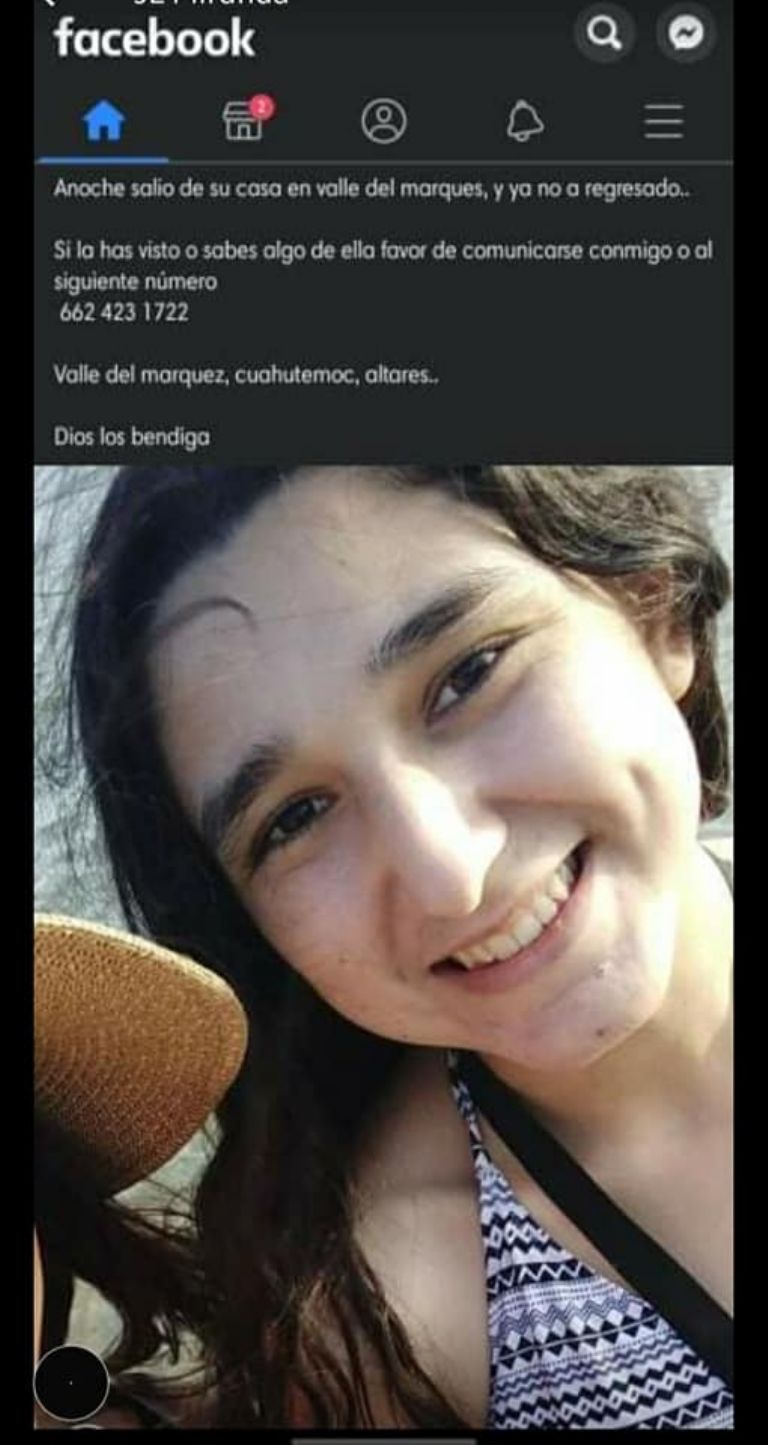 "Desapareció mi hermana Wendy Rubí Montaño Guerrero, amistades, Valle del Marquez, Cuauhtémoc, Altares, si alguien sabe de ella, favor de avisarme, salió anoche y no regresó. Compartir por favor", se lee en Facebook.