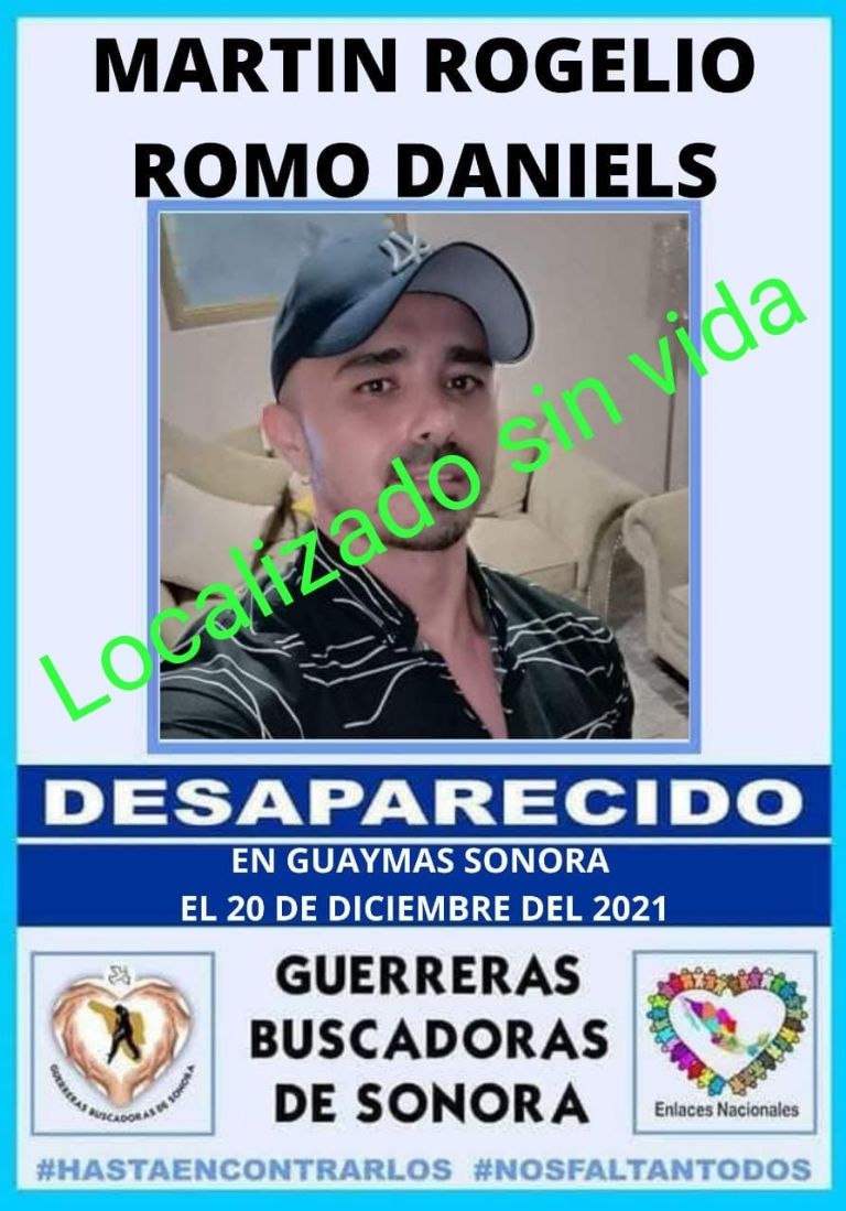 Pero desafortunadamente, este lunes, la agrupación de mujeres confirmó que uno de ellos fue localizado sin vida. Se trata de Martín Rogelio Romo Daniels quien era buscado desde el lunes 20 de diciembre de 2021.