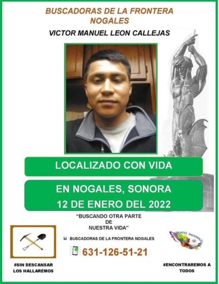 Hermosillo, Sonora.- El colectivo Buscadoras de la Frontera Nogales infirmó este miércoles que Víctor Manuel León Callejas fue localizado con vida, luego de que sus familiares reportaran su desaparición en Nogales, Sonora.
