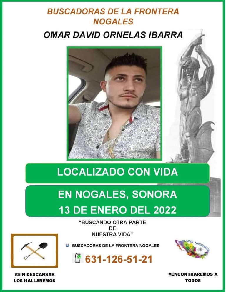 Nogales, Sonora.- El colectivo Buscadoras de la Frontera Nogales confirmó que Omar David Ornelas Ibarra fue localizado con vida, luego de que su familia lo reportara como desaparecido el año pasado 2021, en Nogales, Sonora.