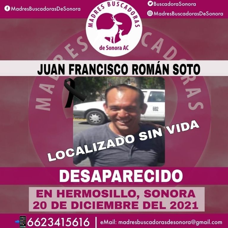 Hermosillo, Sonora.- El colectivo Madres Buscadoras de Sonora confirmó que Juan Francisco Román Soto fue localizado sin vida, luego de que fuera reportado como desaparecido desde el año pasado 2021, en Hermosillo, Sonora.