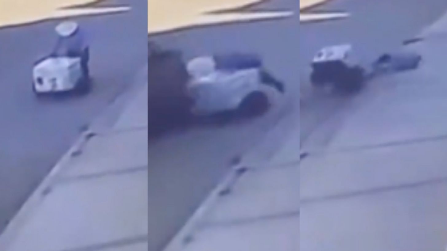 Guamúchil, Sinaloa.- A través de las redes sociales se ha hecho viral el momento exacto en que un hombre de 75 años de edad y quien se gana la vida vendiendo paletas heladas y 'bolis' por las calles de Guamúchil, circulaba sobre la vía pública empujando el carrito que contiene los productos que oferta cuando un automovilista lo embiste haciendo que éste caiga abruptamente sobre la cinta asfáltica.