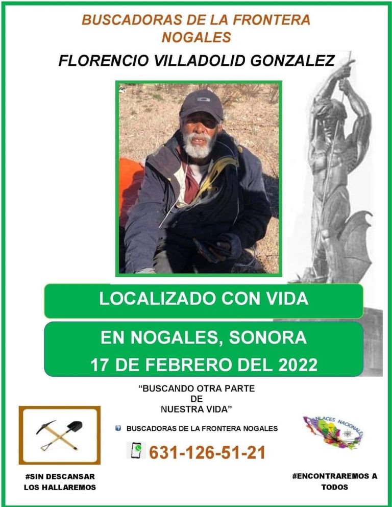 Nogales, Sonora.- Este jueves, el colectivo Buscadoras de la Frontera Nogales confirmó que el señor Florencio Valladolid González fue encontrado con vida, tras casi un año de haber sido reportado como desaparecido.