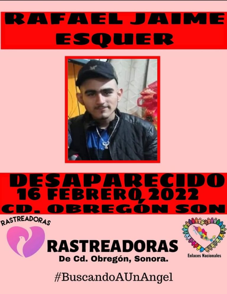 Ciudad Obregón, Sonora.- Familiares y amigos solicitan la colaboración de la comunidad para localizar a Rafael Jaime Esquer, joven que se encuentra en calidad de desaparecido desde hace días en Ciudad Obregón, Sonora.