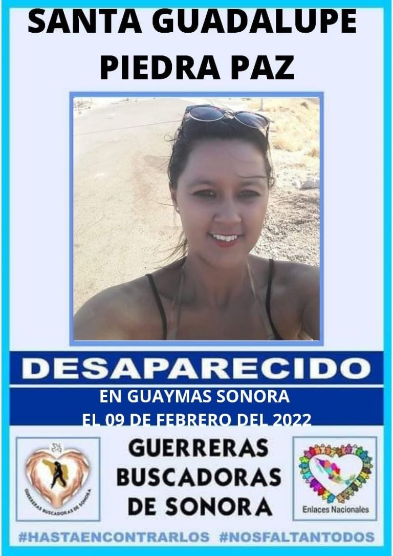 Guaymas, Sonora.- El colectivo Guerreras Buscadoras de Sonora pide la ayuda de la comunidad para encontrar a Santa Guadalupe Piedra Paz, mujer que se encuentra desaparecida desde hace varios días en Guaymas, Sonora.