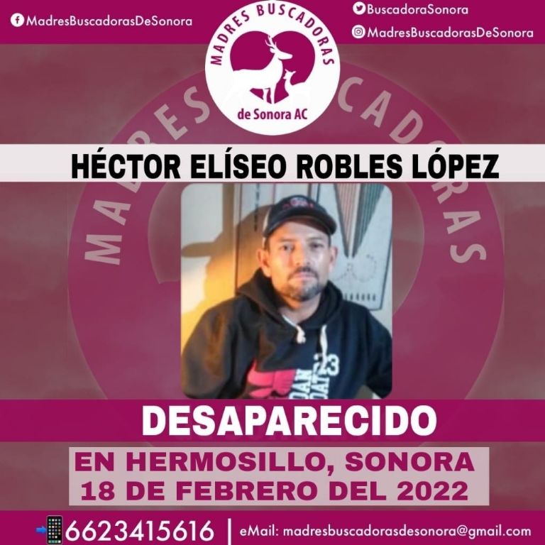 Hermosillo, Sonora.- El colectivo Madres Buscadoras de Sonora reportó este fin de semana la desaparición de Héctor Elíseo Robles López, vecino de Hermosillo, Sonora, de quien nada se ha sabido en los últimos días.