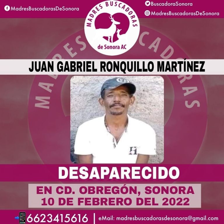 Hermosillo, Sonora.- El colectivo Madres Buscadoras de Sonora solicita el apoyo de la ciudadanía para encontrar a Juan Gabriel Ronquillo Martínez, quien se encuentra desaparecido desde hace más de una semana en Ciudad Obregón, Sonora.