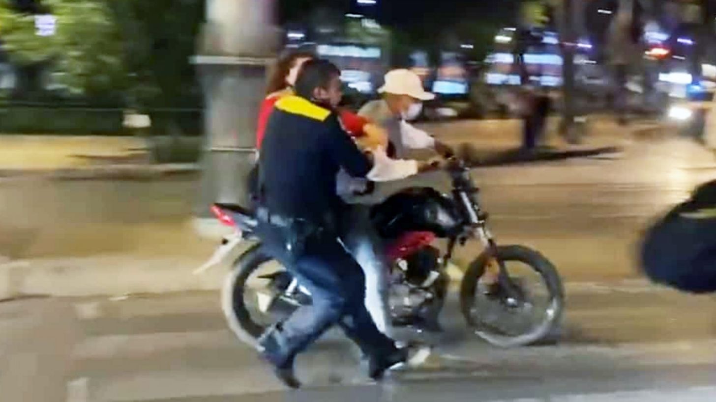 Un video muestra cómo el agente esquivó la moto y trató de tomar el manubrio, pero el conductor le lanzó una patada y siguió circulando.