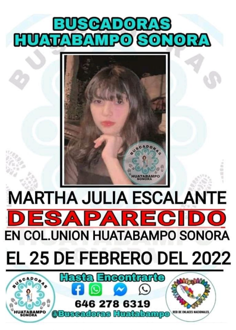 Hermosillo, Sonora.- Momentos de preocupación y angustia vive una familia de Huatabampo, Sonora que pide el apoyo de la ciudadanía para localizar a Martha Julia Escalante Ibarra, joven que se encuentra desaparecida desde hace varios días.