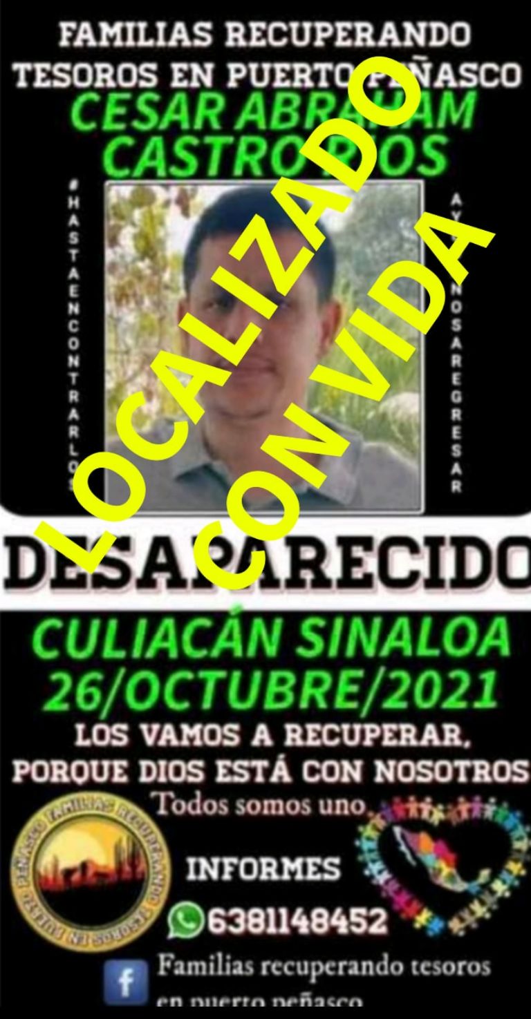 Magdalena de Kino, Sonora.- El colectivo Familias Recuperando Tesoros en Puerto Peñasco informó que César Abraham Castro Ríos fue localizado con vida, luego de permanecer cerca de 4 meses en calidad de desaparecido en Culiacán, Sinaloa.