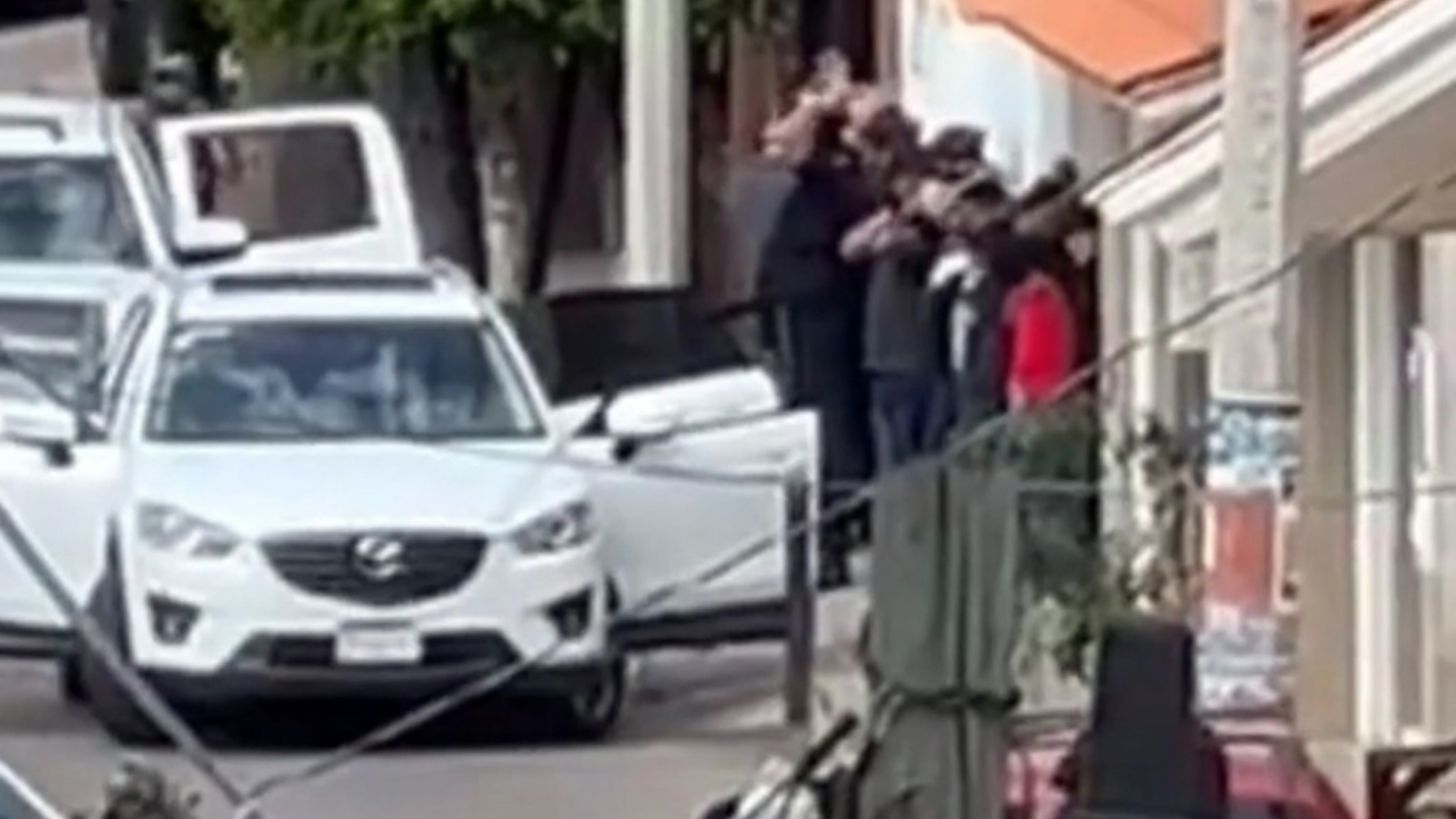 Al tiempo, sujetos armados con fusiles de asalto preparan sus armas y apuntan desde la acera de enfrente hacia donde están las víctimas. Después, abren fuego en su contra a quemarropa.