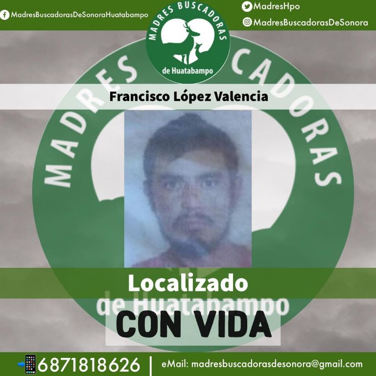 Caborca, Sonora.- El colectivo Madres Buscadoras de Sonora confirmó este lunes que Francisco López Valencia fue localizado con vida, luego de que en 2021 fuera reportado como desaparecido en Caborca, Sonora.
