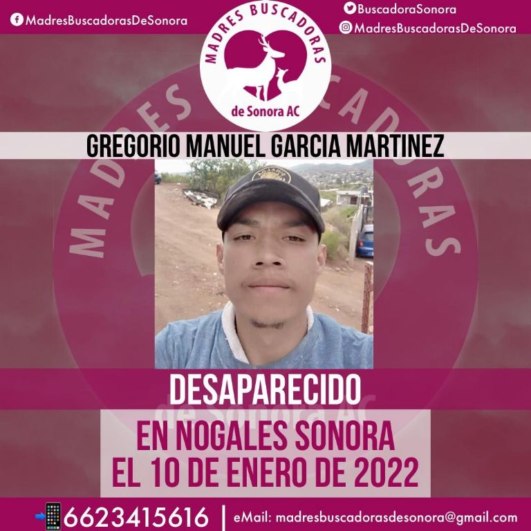 Nogales, Sonora.- El colectivo Madres Buscadoras de Sonora denunció la desaparición de Gregorio Manuel García Martínez, de quien nada se ha sabido desde hace casi 2 meses y piden ayuda para dar con su paradero.