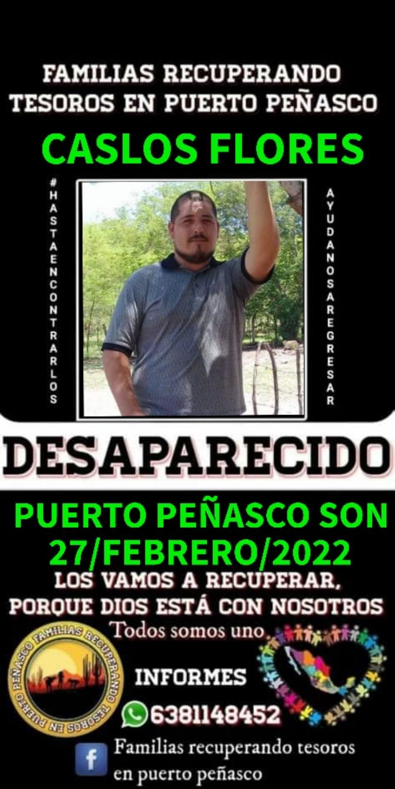 Puerto Peñasco, Sonora.- Este lunes, el colectivo Familias Recuperando Tesoros en Puerto Peñasco reportó la desaparición de Carlos Flores Covarrubias, quien se encuentra extraviado desde hace varias horas en su natal Puerto Peñasco, Sonora.