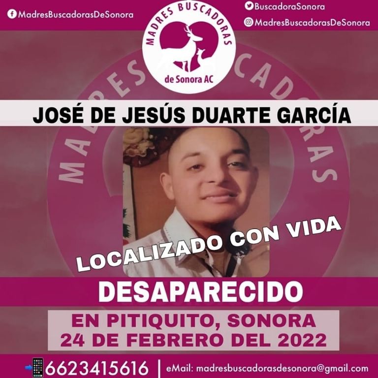 Pitiquito, Sonora.- José de Jesús Duarte García fue localizado con vida, luego de que su familia lo reportara como desaparecido el mes pasado en la comunidad de Pitiquito, Sonora, informó el colectivo Madres Buscadoras de Sonora.