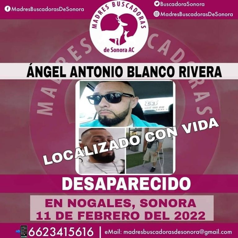 Nogales, Sonora.- Ángel Antonio Blanco Rivera fue reportado como desaparecido en Nogales, Sonora, pero por fortuna fue localizado con vida, así lo confirmó el pasado domingo el colectivo Madres Buscadoras de Sonora.