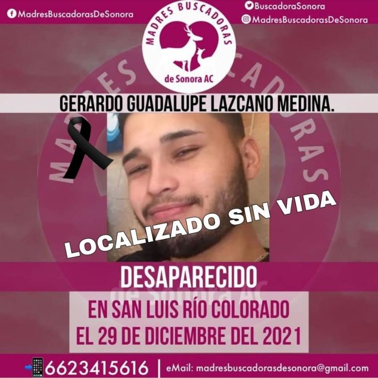 San Luis Río Colorado, Sonora.- Esta tarde de miércoles, el colectivo Madres Buscadoras de Sonora informó que Gerardo Guadalupe Lazcano Medina fue localizado sin vida, luego de permanecer cerca de tres meses en calidad de desaparecido.