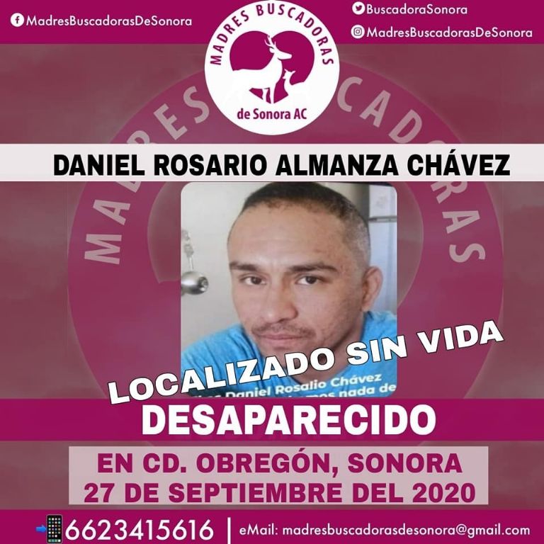 Ciudad Obregón, Sonora.- Este miércoles, el colectivo Madres Buscadoras de Sonora informó que Daniel Rosario Almanza Chávez fue localizado sin vida, luego de permanecer cerca de un año y medio en calidad de desaparecido.