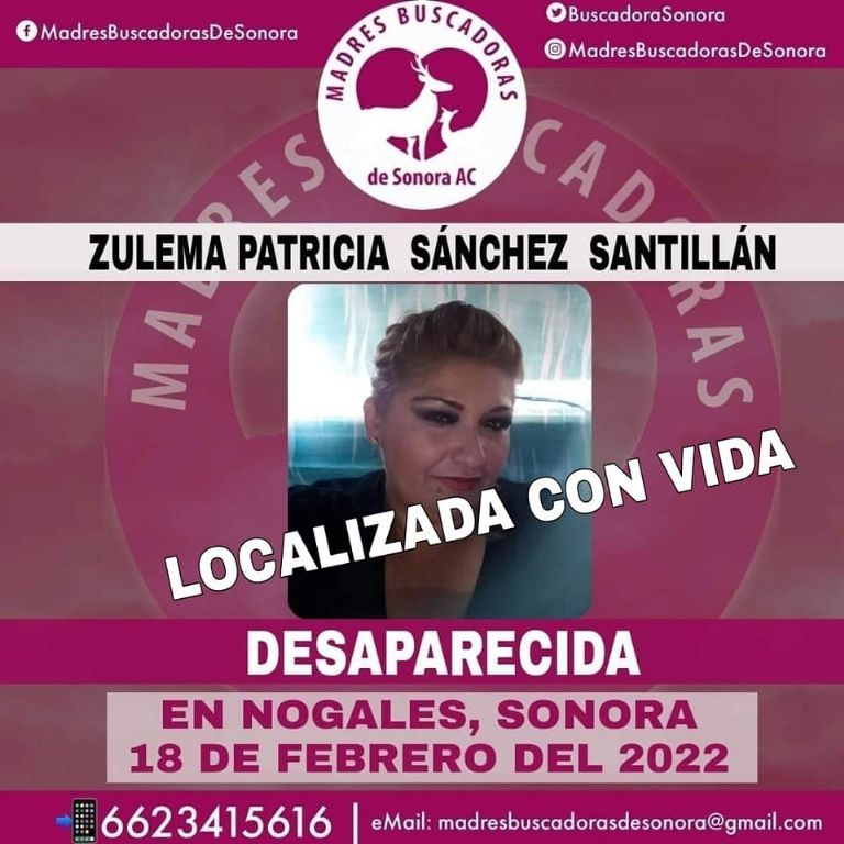 Nogales, Sonora.- El colectivo Madres Buscadoras de Sonora informó este miércoles que Zulema Patricia Sánchez Santillán fue localizada con vida luego de permanecer casi un mes en calidad de desaparecida en Nogales, Sonora.