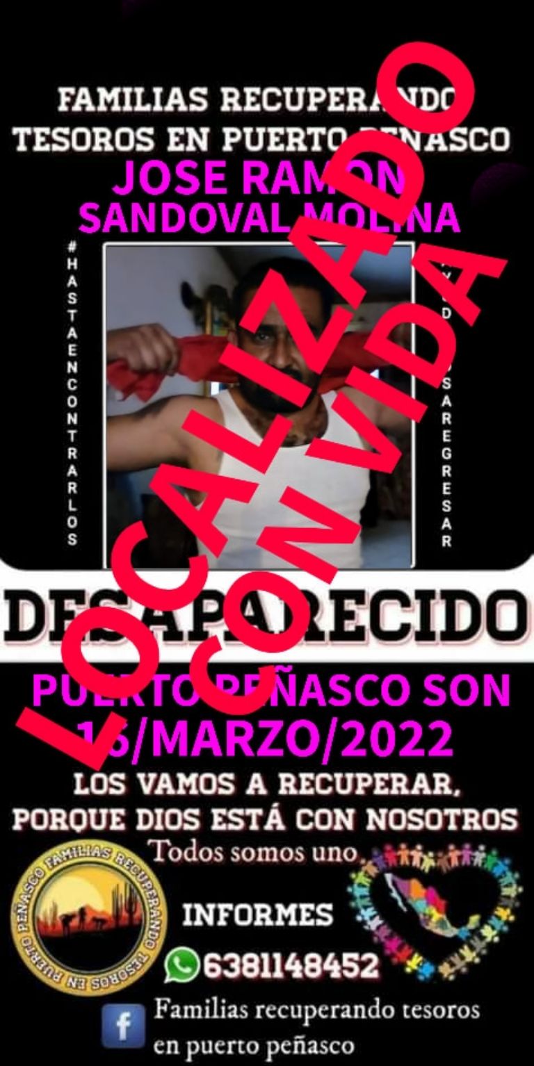 Puerto Peñasco, Sonora.- Este fin de semana, el colectivo Familias Recuperando Tesoros en Puerto Peñasco informó que José Ramón Sandoval Molina fue encontrado con vida luego de varios días en calidad de desaparecido.